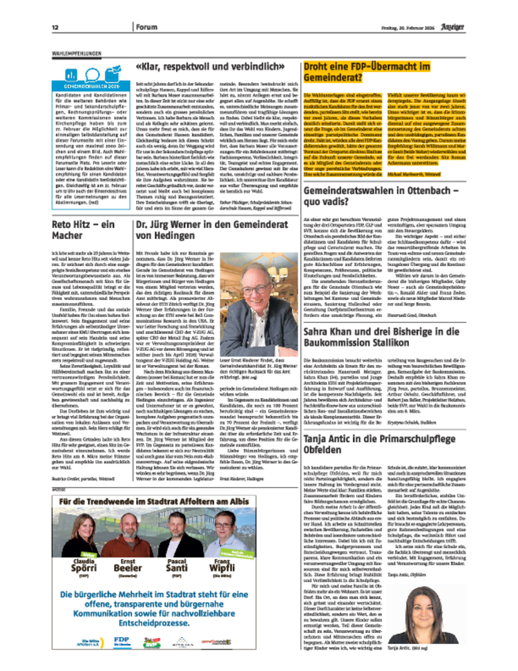 Der Vorwurf einer drohenden «FDP-Übermacht» im Gemeinderat verkennt die Realität unserer direkten Demokratie. In Wettswil entscheiden nicht Parteien, sondern die Stimmbürgerinnen und Stimmbürger. Wer gewählt wird, erhält sein Mandat vom Volk – und ist diesem verpflichtet, nicht einem Parteivorstand.